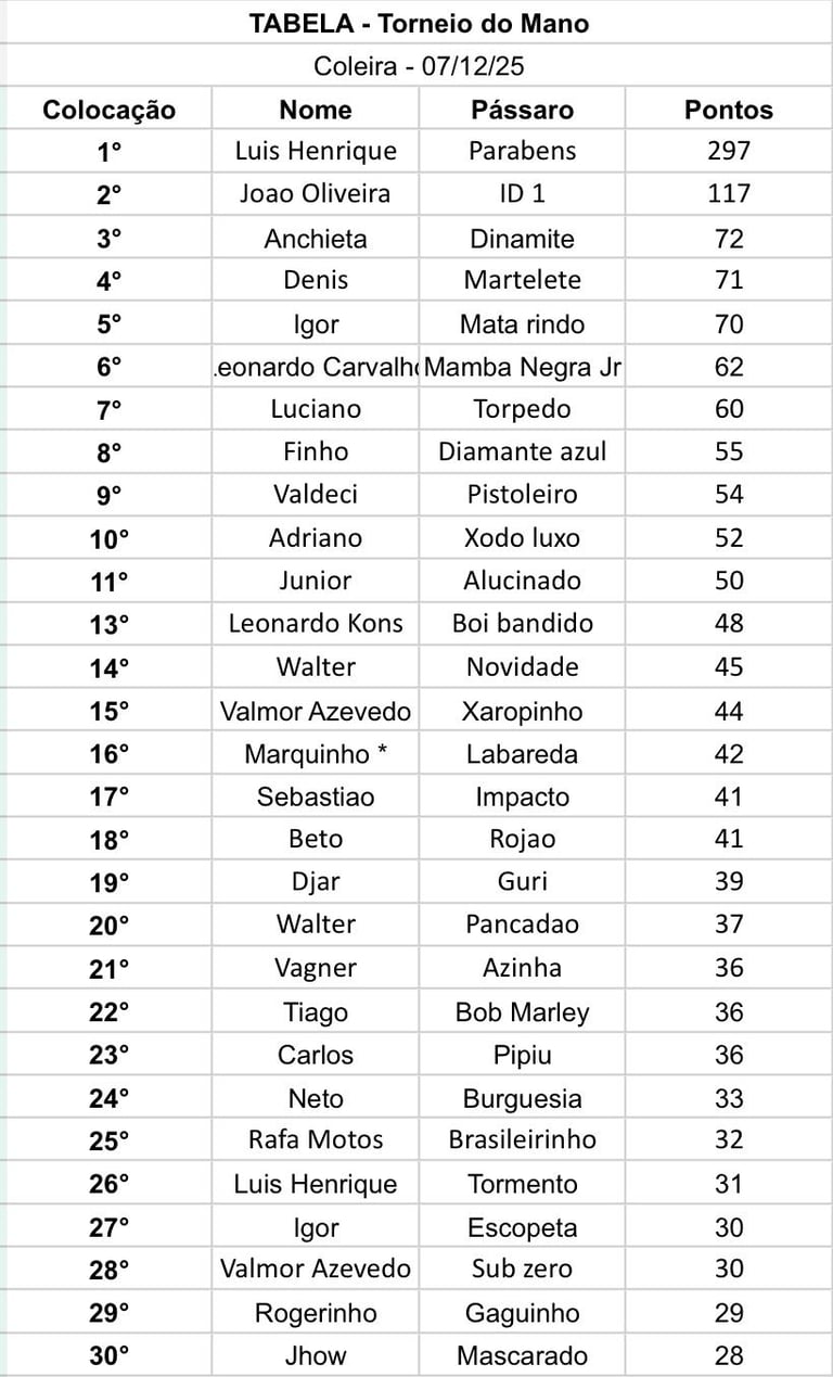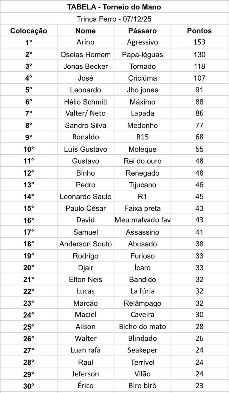 Aqui você acompanha o resultado TOTAL dos torneios.