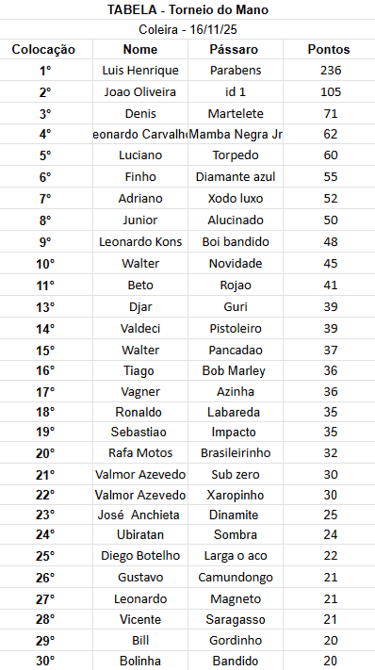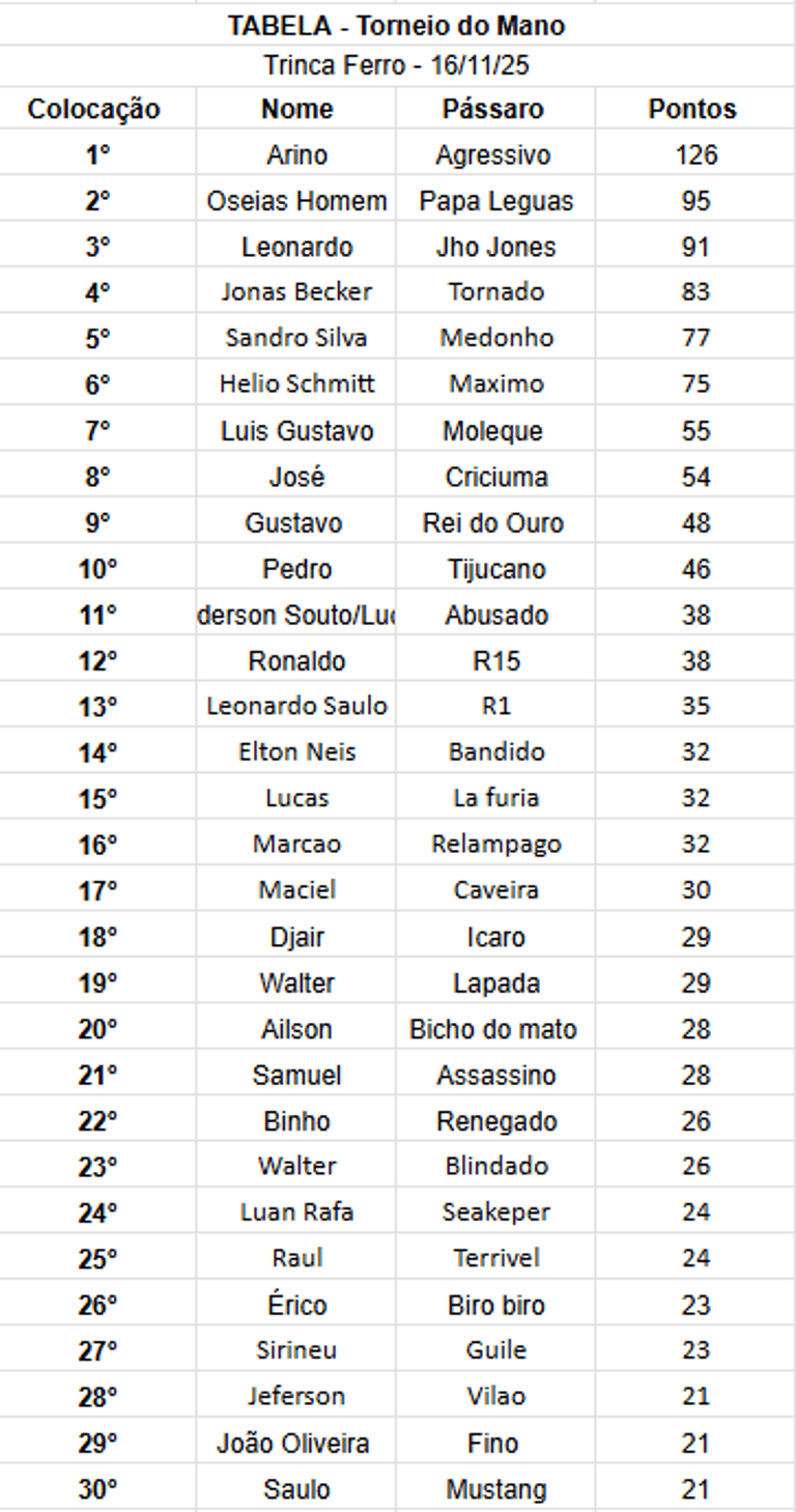 Aqui você acompanha o resultado TOTAL dos torneios.